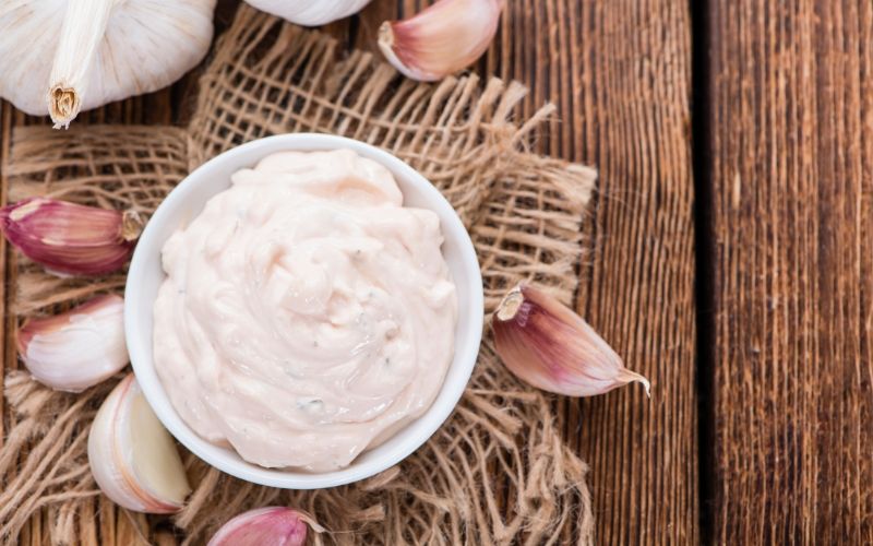 - En un vaso de batidora pon el aceite de oliva, la bebida de soja, el zumo de limón y la sal. Bate lentamente sin levantar la batidora del culo del vaso