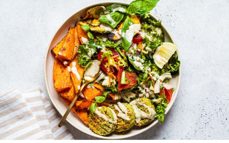 5. Assemble your salad: add a base of lettuce, tomato, sweet potato, and 3 falafel balls. Add the sauce on top.